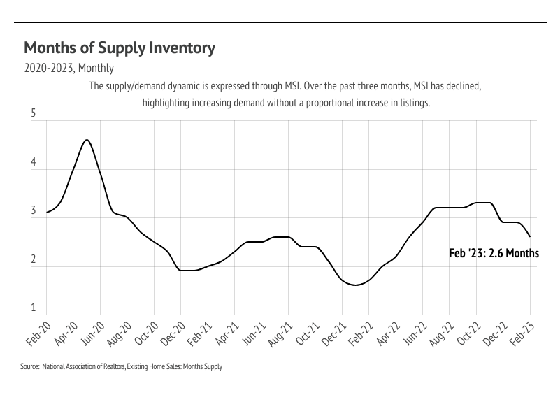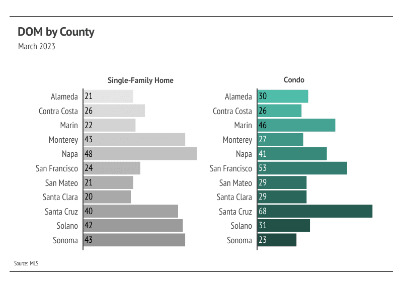 Months of Supply Inventory (MSI) quantifies the supply/demand relationship by measuring how many months it would take for all current homes listed on the market to sell at the current rate of sales. The long-term average MSI is around three months in California, which indicates a balanced market. An MSI lower than three indicates that there are more buyers than sellers on the market (meaning it’s a sellers’ market), while a higher MSI indicates there are more sellers than buyers (meaning it’s a buyers’ market). MSI dropped in February and March, meaning the market now strongly favors sellers. The sharp drop in MSI occurred due to increasing sales, low inventory, and less time on market.