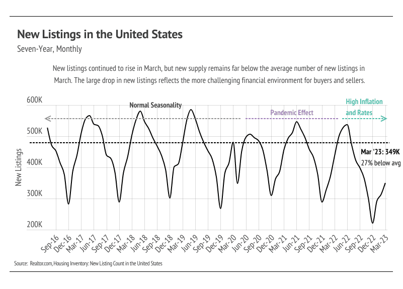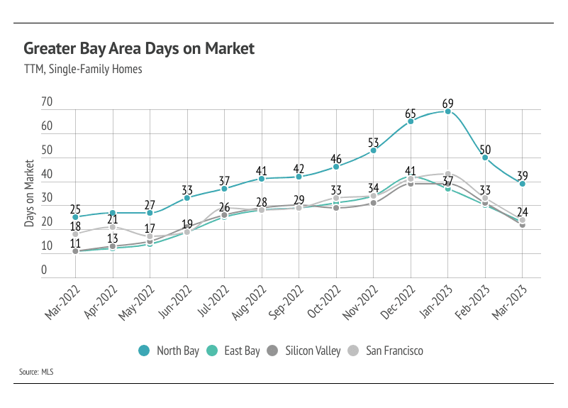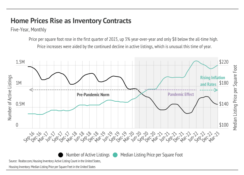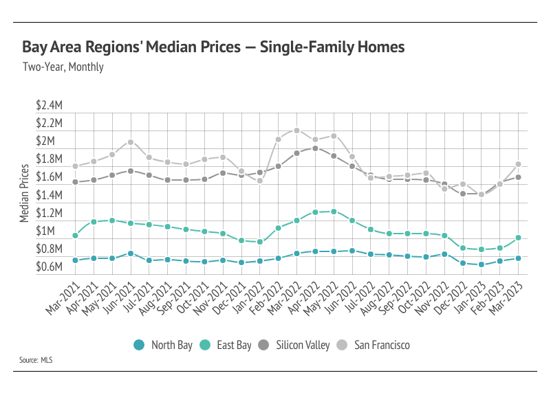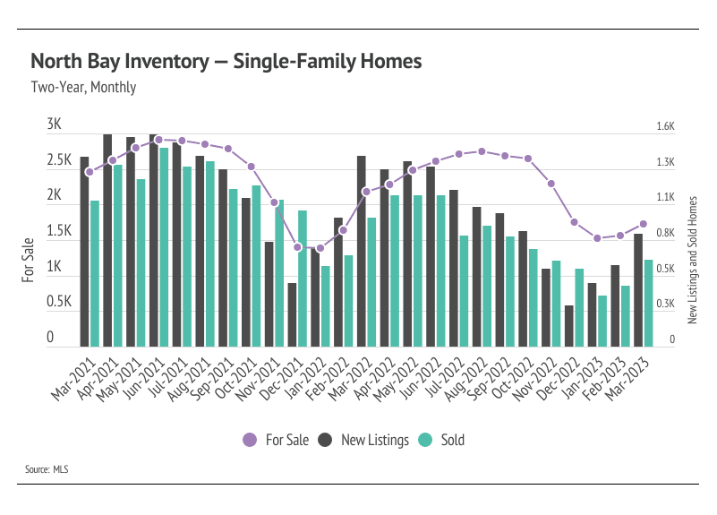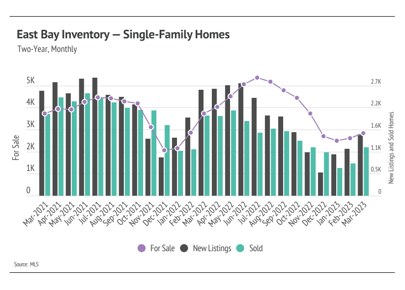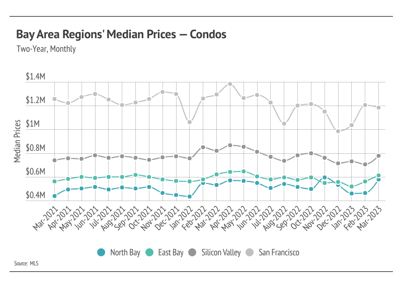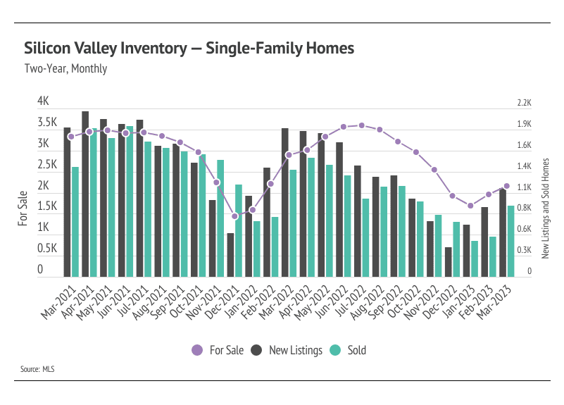 Every year, by at least March, we expect to see inventory rise after a higher number of new listings comes to market, which easily accommodate the increase in sales we also tend to see in the first half of the year. Inventory in the Bay Area, thankfully, increased in February and March, unlike the inventory in many other major markets, which is continuing to decline. Typically, inventory grows in the first half of the year, peaking in June or July. The Bay Area has enough demand that many more homes could come to market before the market moves into balance between buyers and sellers. Currently, sales are still below last year’s level, but we expect sales to climb higher in the second quarter with more homes coming to market. As demand increases, competition among buyers (and therefore prices) will climb with it. Bay Area home prices are still significantly below their all-time highs. However, if active listings unexpectedly plateau or drop in the second quarter, we could easily see single-family home and condo prices rise significantly into the summer.