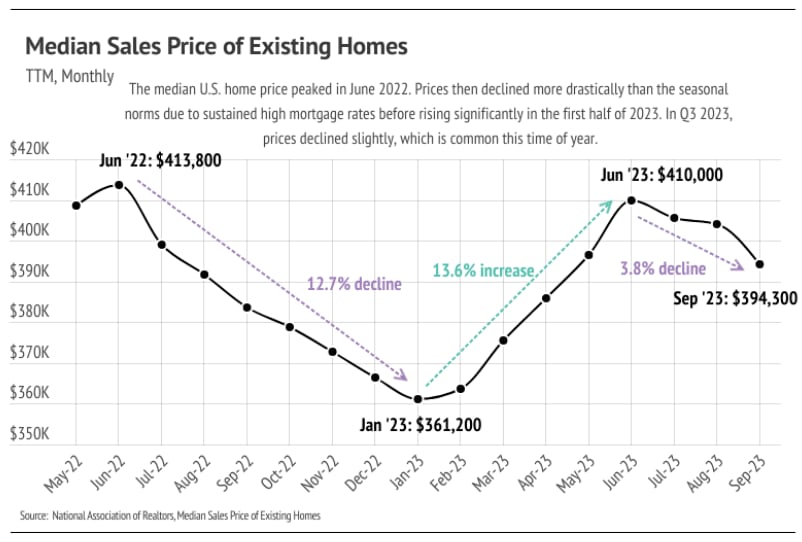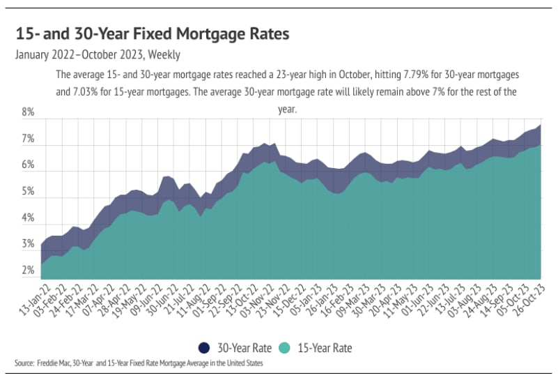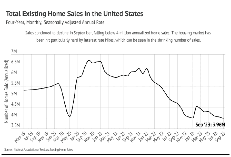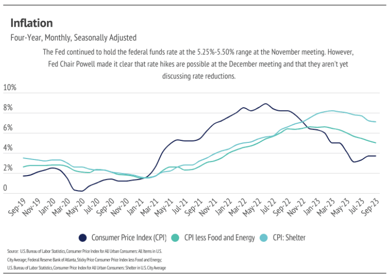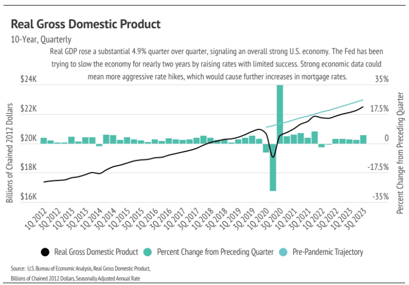 High mortgage rates aren’t going away anytime soon because inflation is still about twice as high as the Fed would like. So far, most of the economic slowing the Fed intended by raising rates seems to be isolated to the housing market. The National Association of Realtors (NAR) reported that the number of homes sold dropped 2.0% month over month and 15.4% year over year to the lowest number of sales in the four years that NAR reports. Real GDP rose significantly in Q3 2023, indicating strong U.S. economic growth rather than economic slowdown.