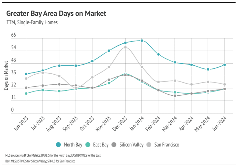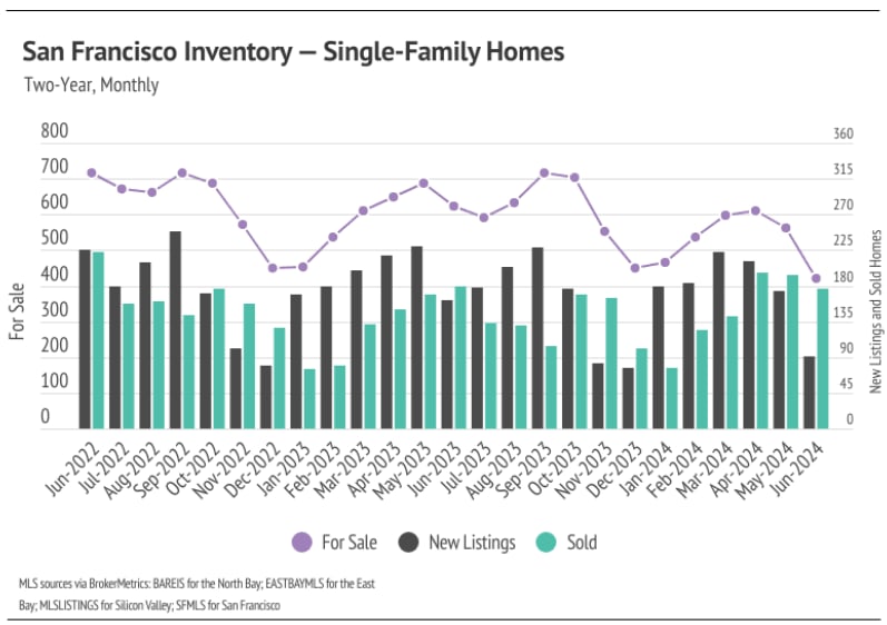 Active listings, sales, and new listings fell across most of the Bay Area month over month, which is normal this time of year. We expect inventory growth to slow in the second half of the year.