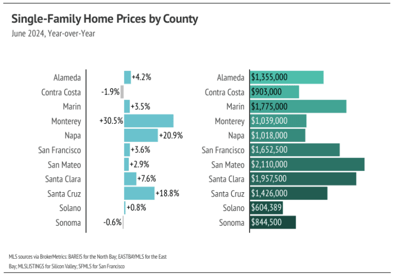 Months of Supply Inventory (MSI) quantifies the supply/demand relationship by measuring how many months it would take for all current homes listed on the market to sell at the current rate of sales. The long-term average MSI is around three months in California, which indicates a balanced market. An MSI lower than three indicates that there are more buyers than sellers on the market (meaning it’s a sellers’ market), while a higher MSI indicates there are more sellers than buyers (meaning it’s a buyers’ market). The Bay Area markets tend to favor sellers, which is reflected in their low MSIs. San Francisco MSI is notable for its variability over the past year, oscillating from buyers to sellers’ markets twice over the course of 12 months. Currently, MSI is below three months of supply (a sellers’ market) in every Bay Area County, except for single-family homes in Napa, which favor buyers, and condos in the North Bay, East Bay, and San Francisco, which are now balanced.