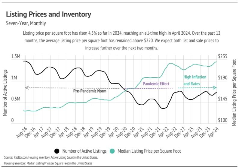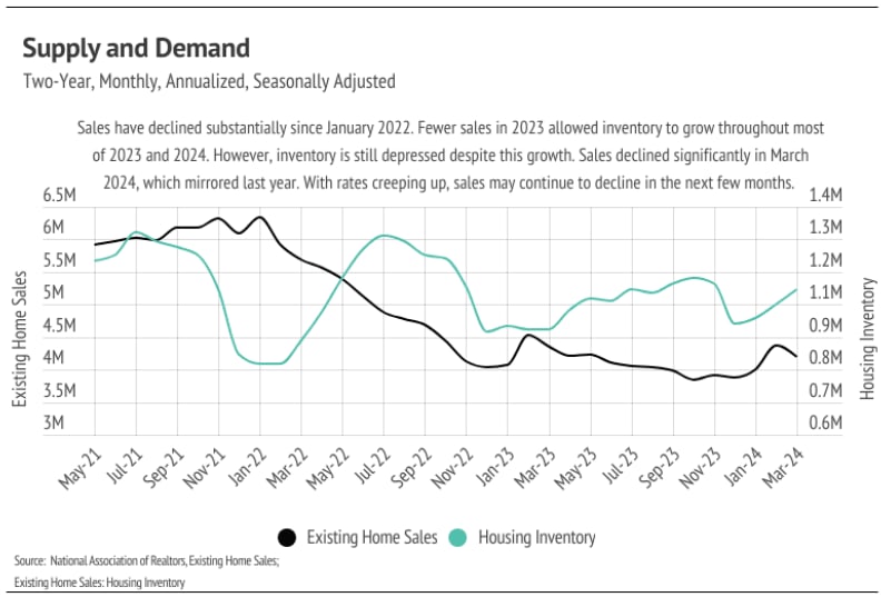 Higher rates have slowed the housing market, decreasing affordability. April saw a 7% rise in monthly home costs, with a 13% increase from January to April. Sales dropped 4.3% last month, an unusual trend for spring, despite a 4.7% rise in inventory. Buyers are becoming pickier as prices rise, leading to an overall market slowdown.