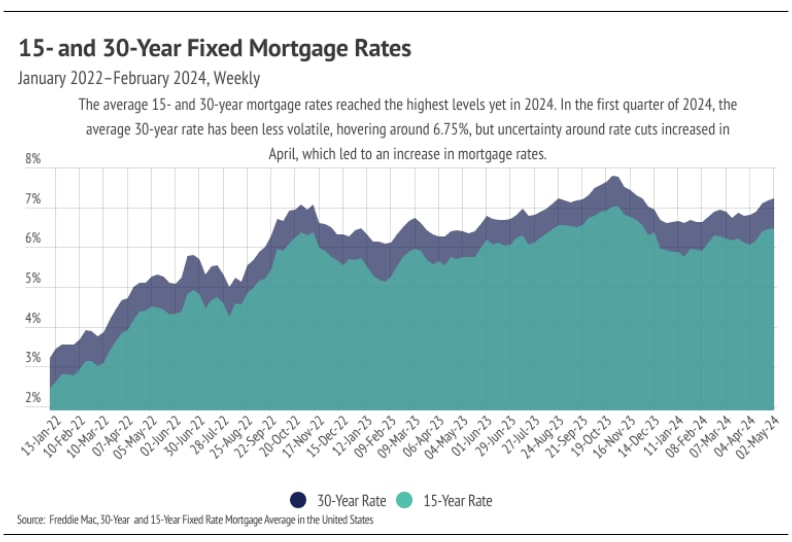 The average 30-year mortgage rate began 2024 at 6.62% and has risen to 7.22% by May, marking the third year of elevated rates. Initially, economists predicted rate cuts, but inflation stalled around 3%, causing the Fed to maintain the federal funds rate at 5.25% to 5.50%. This has led to higher mortgage rates, which increased 0.6% this year, with most of the rise occurring in April.