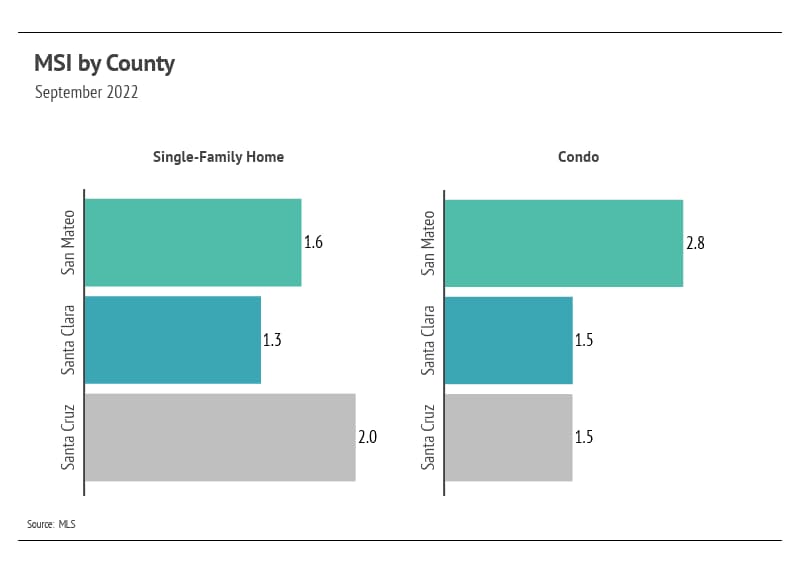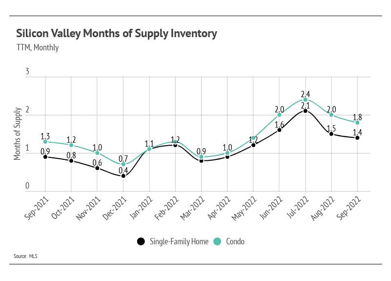Months of Supply Inventory (MSI) quantifies the supply/demand relationship by measuring how many months it would take for all current homes listed on the market to sell at the current rate of sales. The long-term average MSI is around three months in California, which indicates a balanced market. An MSI lower than three indicates that there are more buyers than sellers on the market (meaning it’s a sellers’ market), while a higher MSI indicates there are more sellers than buyers (meaning it’s a buyers’ market). From April to July, MSI climbed higher (toward balance) in Silicon Valley, but MSI fell in August and September, indicating we are still in a sellers’ market.
