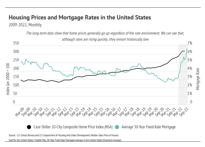 Last September, the average 30-year mortgage rate was 3.01%, meaning that a $500,000 loan would cost $2,100 per month. (That same loan now costs $3,200 per month at 6.70%.) Because the interest rate has such an outsized impact on the affordability of a home, more buyers entered the market, dropping inventory like never before. It was a great time to finance a home, and those buyers who had a down payment rightfully bought even as prices were increasing, since home prices typically continue to increase. This is actually a newer phenomenon, but one that isn’t going away. Since the mid-1990s, home prices began to move more like risk assets (stocks, bonds, commodities, etc.), which marked a huge change from the preceding 100 years. From 1890 to 1990, inflation-adjusted home prices rose only 12%, which is hard to imagine with the massive price growth, up 70% nationally, that we’ve seen over the past 10 years.