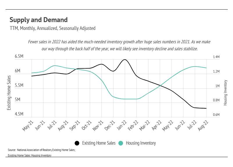 Demand for homes has declined over the past three months, which, besides the rate increase, is the seasonal norm. Because home sellers are often buying as they sell, new listings have dropped as well, causing inventory to decline. Inventory is still historically low and will be the one major buoy for home prices. The market has shifted to softening demand and softening supply. Mortgage applications are down 29% year-over-year according to the Mortgage Bankers Association. This, too, isn’t terribly surprising. Generally, homes aren’t bought and sold over and over in short time frames. The high number of sales in 2021 indicates fewer sales in 2022, especially because the buying incentives in 2021 are no longer in place. We can finally say that the market is cooling, but after the hottest two years since the mid-2000s, cooling indicates a healthier market.