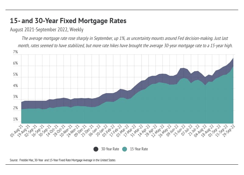 The Fed provided huge incentives to buy homes as part of its easy monetary policy during the pandemic by purchasing Mortgage-Backed Securities (MBS) and dropping interest rates. MBS play an integral role in home financing by allowing banks to bundle and sell mortgage loans, thereby turning the bank into an intermediary between the financier and financial markets (investors). Banks get some fees, and investors, rather than the bank, get the interest from the bundle of mortgages, so in many ways, the bank facilitates the loan but investors are the ones really lending the buyer the money. The Fed was a huge investor in 2020 and 2021, doubling its MBS holdings to $2.7 trillion. However, the Fed isn’t buying any more MBS and, in fact, would like to sell — but can’t do so without taking huge losses. Additionally, mortgage rates have jumped dramatically in 2022, more than doubling, which shines a light on just how unique 2021 was for homebuying.