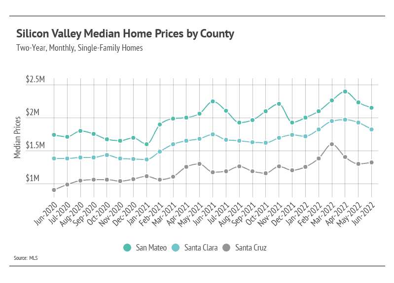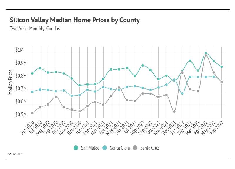 The median single-family home and condo prices in Silicon Valley continued to decline from their April peaks, but they’re still historically high. After two years of significant price growth across markets and dwelling types, it’s hard not to think that rate increases have caused prices to creep near a ceiling. Without the aid of super low financing options, fewer potential buyers will participate in the market. So far in 2022, the average 30-year mortgage rate has increased over 2.5%, which equates to an approximately 33% increase in monthly mortgage payments. In other words, the new mortgage rate adds $730 per month on a $500,000 30-year fixed mortgage, for example (double that for a $1 million loan).