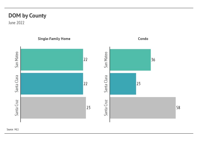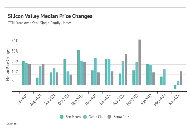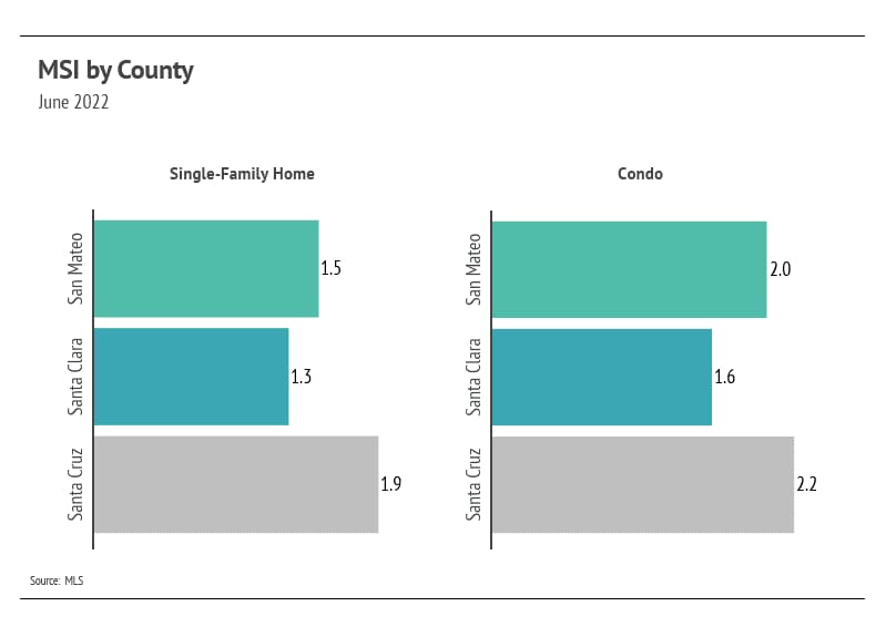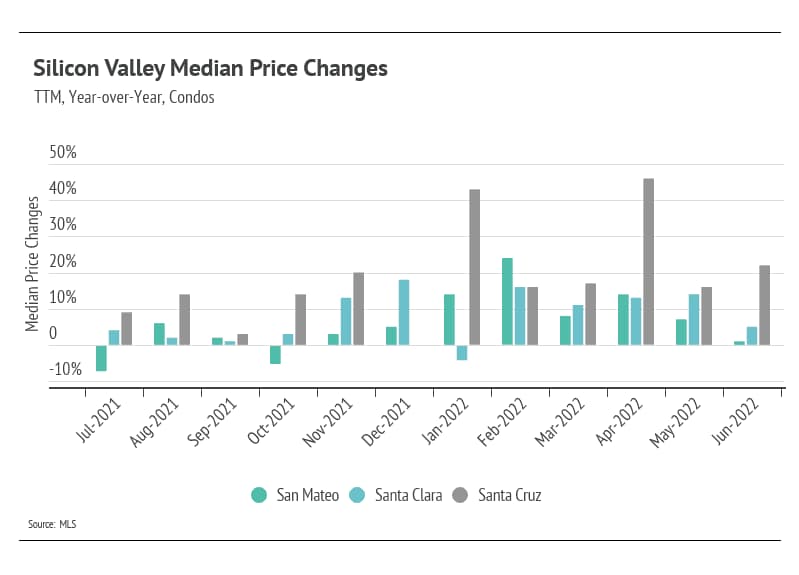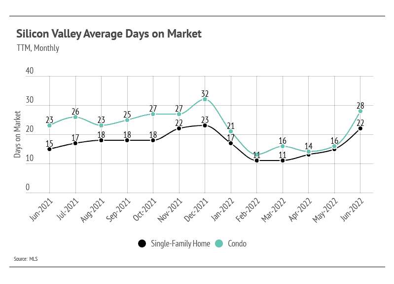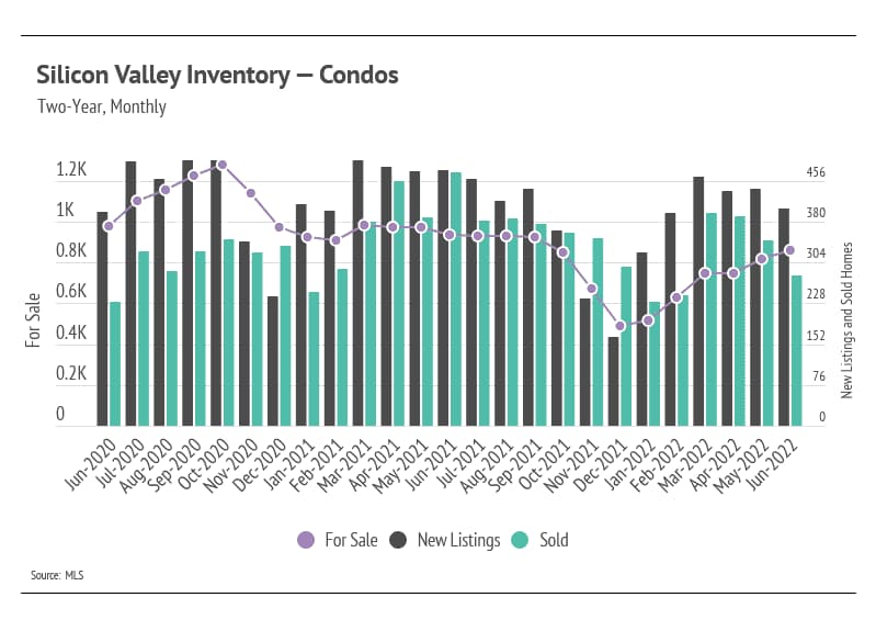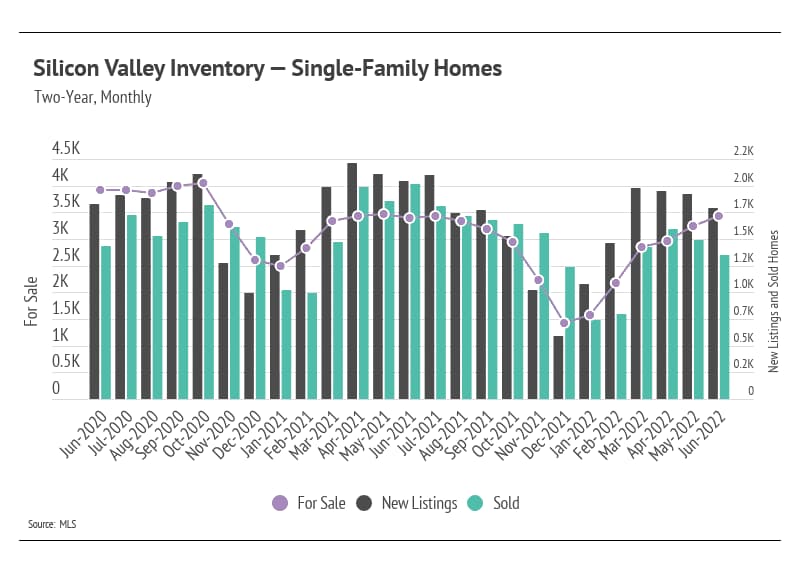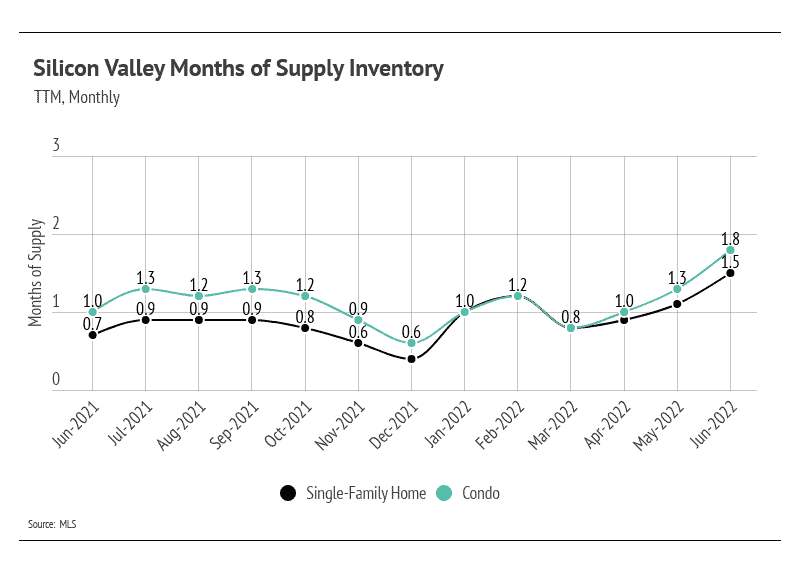 Silicon Valley’s housing inventory continued to rise in June, following historical seasonal trends. Since March 2020, inventory has trended lower and settled at a depressed level. The number of single-family homes and condos on the market in June 2022 is 12% lower than in June 2020. Although the first half of 2022 had one of the lowest inventories on record, we were pleased to see that inventory increased, a trend that usually holds until mid-summer. With June inventory continuing to rise, the next two to three months will likely show us peak inventory levels for 2022, which will undoubtedly be the lowest peak inventory on record.