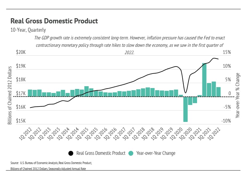 But what about the Fed’s intention to slow down the economy by decreasing demand through raising rates? Won’t that cause a recession and lower home prices? We’ve already seen some slowdown in the Q1 2022 Real Gross Domestic Product (GDP)* data. The Fed’s goal is to slacken growth enough to curb inflation, but not enough to send the U.S. into a recession, which is a challenging needle to thread. The National Bureau of Economic Research, which officially declares recessions, defines a recession as a significant decline in economic activity spread across the economy that lasts more than a few months and is normally visible in real GDP, real income, employment, industrial production, and wholesale-retail sales. With unemployment near all-time lows and a surplus of job openings, we may end up avoiding an official recession, even if GDP decelerates for multiple quarters. U.S. GDP is expected to outpace China’s this year for the first time since 1976, which sounds positive but could be a clear sign of a major slowdown given our economic ties.