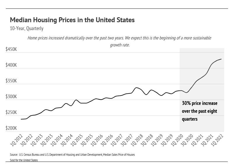 A year ago, the average 30-year mortgage rates hit their lowest levels in history and have more than doubled since then, to 5.81%. Let’s take a look at some numbers to see how assets have performed in the first half of 2022: The S&P 500 declined 21% (the worst first half of the year since 1970), the NASDAQ is down 30%, and Bitcoin and Ethereum have dropped 59% and 71%, respectively. At the same time, U.S. housing prices increased by 15% nationally. Home prices, simply, rarely go down. Even if you weren’t directly affected by the 2006 housing bubble, you likely knew someone who was. One lasting effect of the housing bubble is the perception that home prices decline much like other risk assets, which isn’t the case. Stocks, bonds, and cryptocurrency are fungible assets that allow for large, multiplayer markets. The housing market has only recently become more efficient because of technology, but too many factors play into a home’s value, preventing regular downturns in the market. Large declines in liquid assets do affect demand for homes, though, as people tend to reconsider buying when they feel (and objectively are) less wealthy during dips in those markets.